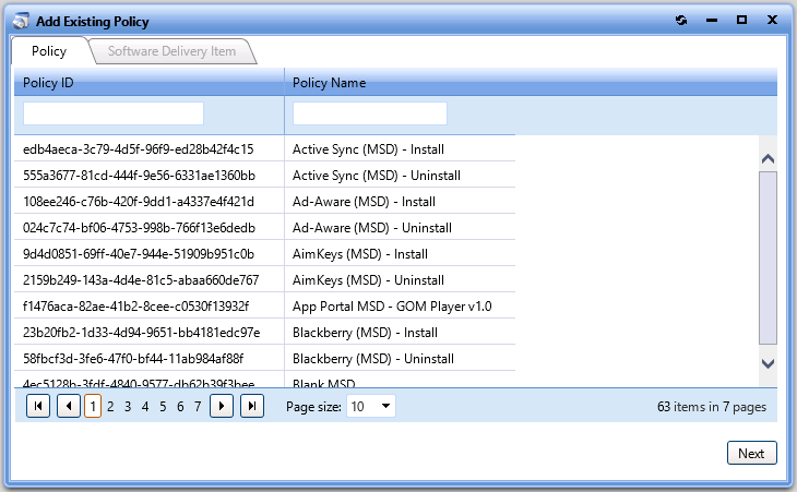 20. Select a policy and click Next , the Software Delivery Item tab opens.