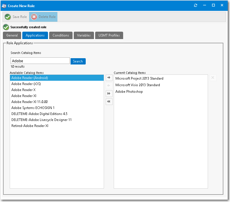 8. Click Save Role to create the new role. You will notice the following tabs become available for you to further configure the role properties: Conditions , Variables , and USMT Profiles .