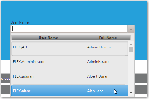 • Switching to a different user of the same device—If you enter a device or user name, a device along with an associated user is added to the Selected list. If you want to select that device but with a different assigned user, click the user icon in the Action column. A user name selection dialog box opens.